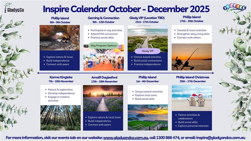 Each Inspire Group Program consists of 3-7 days of group goal related activities and individual support for all participants. They are held in different Glady and Co group locations throughout the year and focus on building daily life skills, improving social connections and building a strong peer community through enjoyable activities and workshops.
